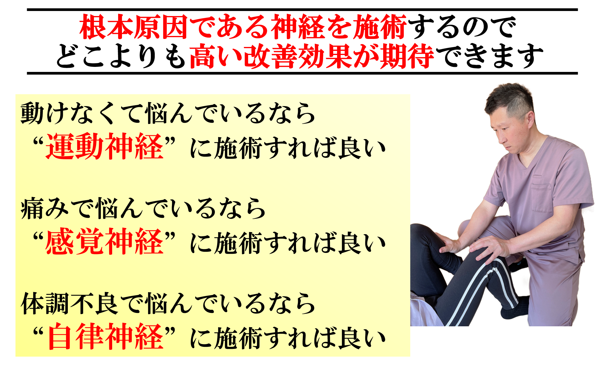従来の治療法は、硬くなった筋肉をほぐして、血流改善させて身体を改善に導いたり、関節をボキボキ鳴らして身体の歪みを整えて改善へ導く施術がほとんどです。